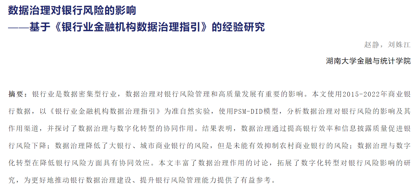 近日,色色动漫 应用金融系赵静副教授和2022级硕士研究生刘姝江合作的题为“数据治理对银行风险的影响——基于《银行业金融机构数据治理指引》的经验研究”的论文发表在《金融研究》2025年第2期。