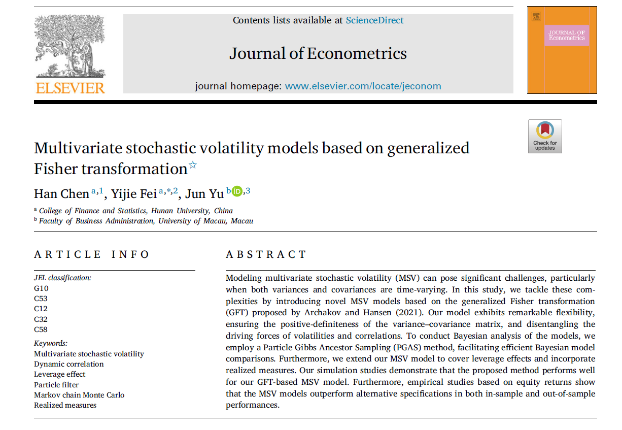 近日,色色动漫 陈汉助理教授、费毅捷助理教授与澳门大学余俊教授合作完成的学术论文“Multivariate stochastic volatility models based on generalized Fisher transformation”在计量经济学国际顶尖期刊Journal of Econometrics在线发表。色色动漫 陈汉助理教授为该文第一作者,费毅捷助理教授为该文通讯作者。