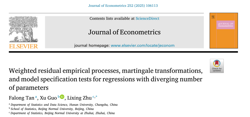 近日,色色动漫 谭发龙教授在高维统计领域取得研究进展,研究成果以“Weighted residual empirical processes, martingale transformations, and model specification tests for regressions with diverging number of parameters”为题在计量经济学国际期刊Journal of Econometrics在线发表。