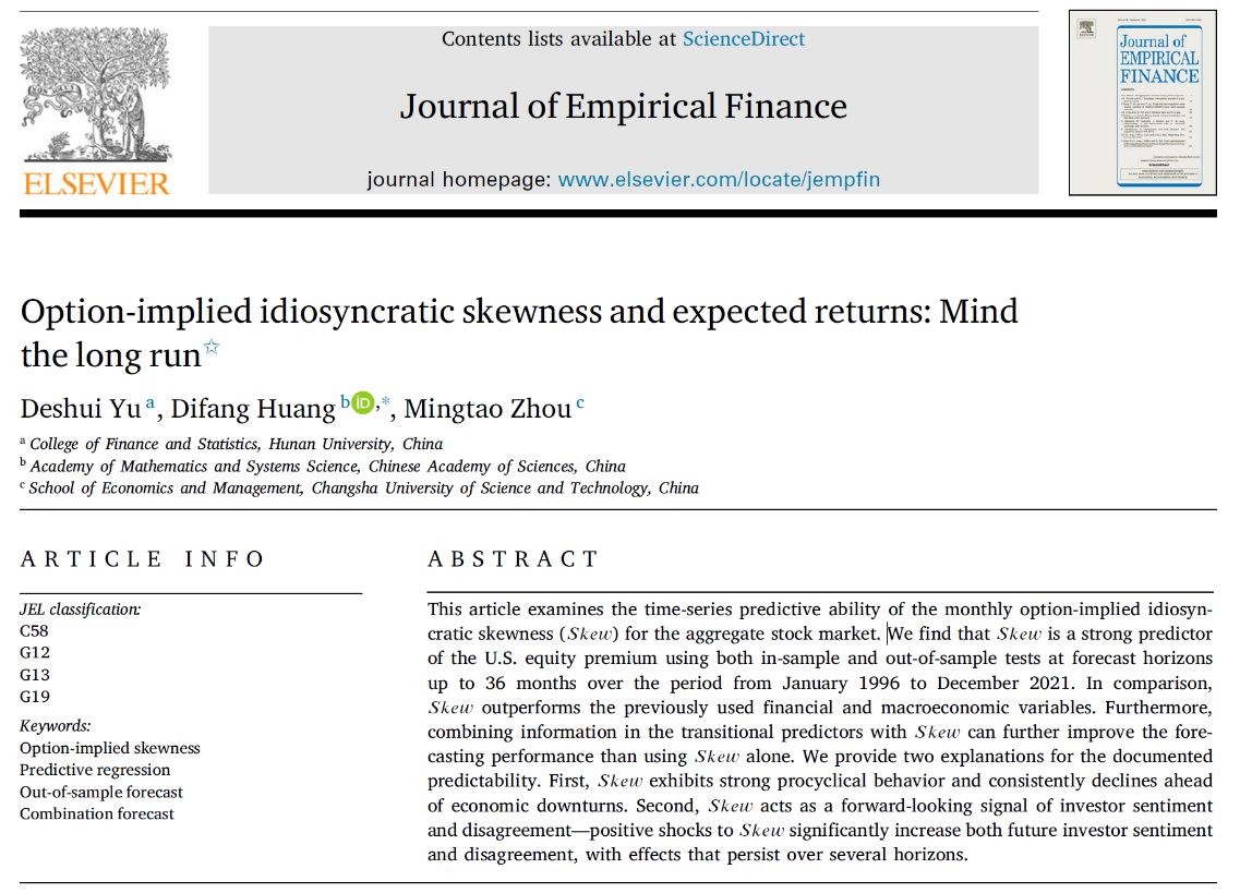 近日,色色动漫 金融科技与工程系余得水副教授的论文“Option-implied idiosyncratic skewness and expected returns: Mind the long run”在院定A2类期刊Journal of Empirical Finance,volume 83,September2025发表。