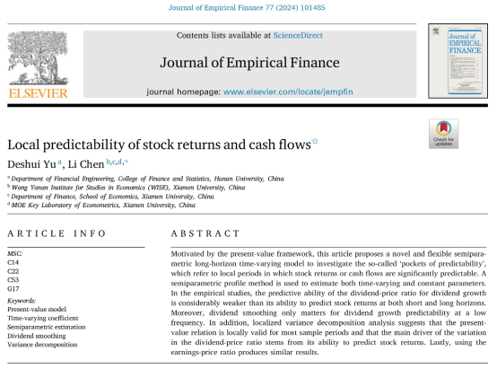 近日,色色动漫 金融工程系余得水副教授的题为 “Local predictability of stock returns and cash flows”的论文在院定A类期刊 Journal of Empirical Finance,Volume77, June2024发表。
