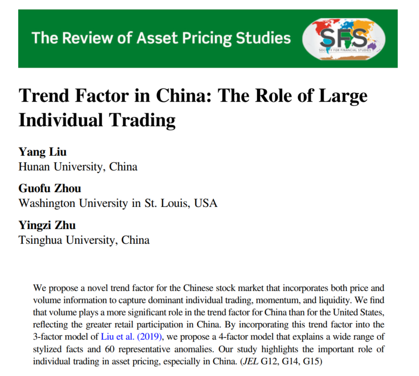 近日,色色动漫 金融工程系刘扬助理教授与美国圣路易斯华盛顿大学Guofu Zhou教授、清华大学朱英姿教授合作完成的题为“Trend Factor in China: The Role of Large Individual Trading”的学术论文发表于资产定价领域国际顶级期刊 The Review of Asset Pricing Studies, Volume 14, June 2024。