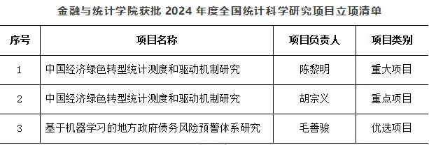日前,国家统计局官网发布《2024年度全国统计科学研究项目立项公告》。色色动漫 陈黎明教授申报的课题“中国经济绿色转型统计测度和驱动机制研究”获批重大项目立项,胡宗义教授申报的课题“中国经济绿色转型统计测度和驱动机制研究”获批重点项目立项,毛善骏助理教授申报的课题“基于机器学习的地方政府债务风险预警体系研究”获批优选项目立项。