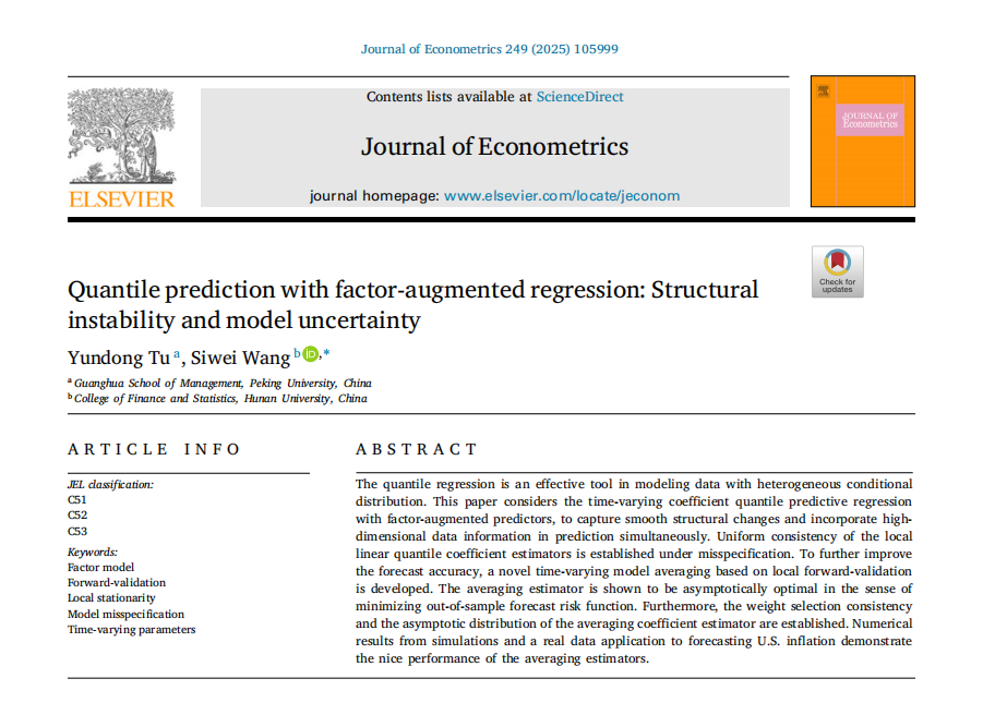 近日,色色动漫 汪思韦助理教授与北京大学涂云东教授合作完成的学术论文“Quantile prediction with factor-augmented regression: Structural instability and model uncertainty”在计量经济学国际顶尖期刊Journal of Econometrics在线发表。