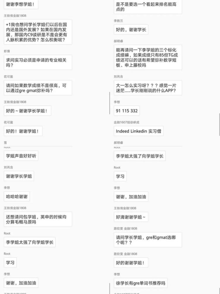 本次交流会共邀请了金统16级徐岍成、李想、包彤三位同学,他们分别就经验、流程和注意事项进行了干货总结,为我们揭开疑惑。其中被加州大学伯克利分校录取的徐岍成同学认为,应该明确自己的目标、制定合理的计划,首先应清楚自己为什么留学、去哪里留学、出国留学的方向选择等。同时他分享了自己的整个准备历程,大一在专注于校内课程的同时打下GPA 基础,加入校学生会和院学生会锻炼自己;大二参加SIT和海外NGO志愿者;大三全力备战GRE并准备申请。