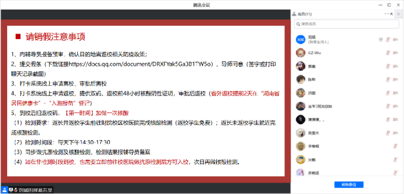 最后,刘斌老师对近期学院的疫情防控工作进行了深入介绍,讲解了最新的疫情防控政策、请销假注意事项和近期全员核酸检测安排,希望各班班长传达至各位同学,严格遵守和支持学校的疫情防控安排。