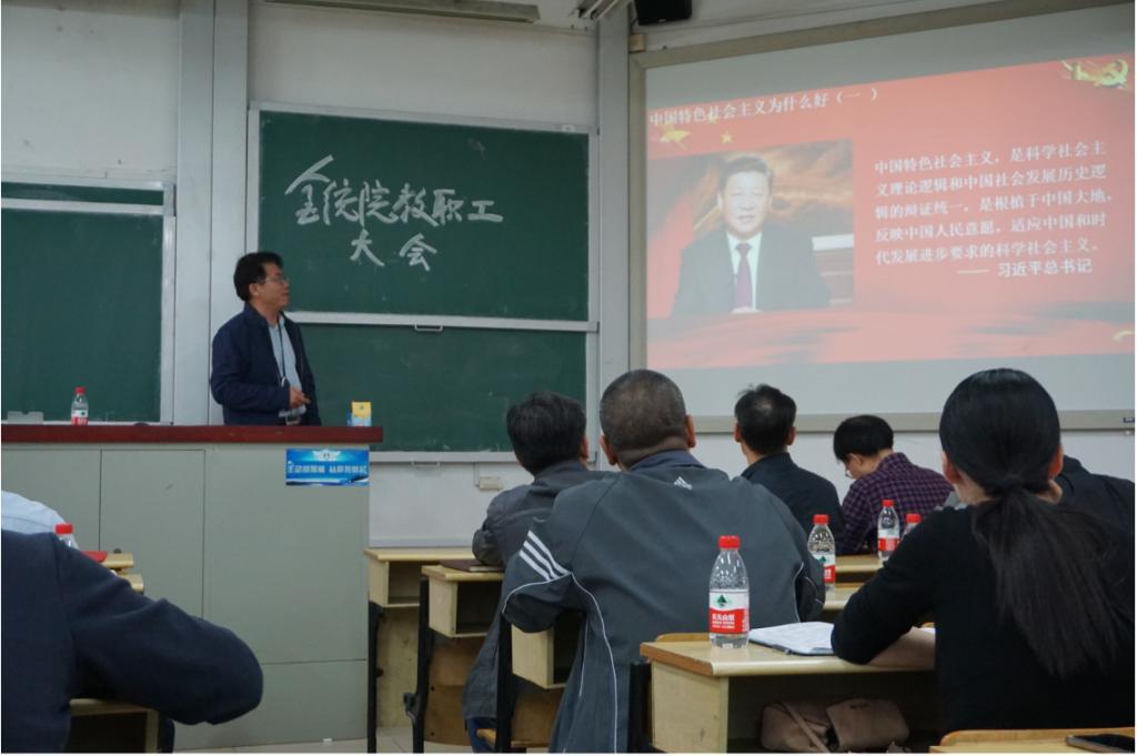 在读原著学原文过程中聂书记从“三个关键词”、“五个坚持”、“三个时间坐标”、“三个万岁”四个方面解读习近平总书记在新中国成立70周年大会上讲话的精神内涵;并同与会人员分享新中国成立70周年伟大成就;带领学院领导班子及全体教职工重温习近平总书记谈“爱国”十段经典话语;最后,通过“中国特色社会主义符合人类社会的发展规律,开辟了科学社会主义发展的新境界;以人民为中心,创造性地满足人民对美好生活的需要”等五个方面阐述“中国特色社会主义为什么好”这一重点议题。专题会上与会人员仔细聆听、认真记录、积极思考。
