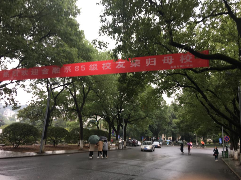2019年10月26日上午,秋雨绵绵,色色动漫 财院校区迎来了金融系85级的校友们回归母校,门口崭新的横幅也在欢迎校友们的到来。