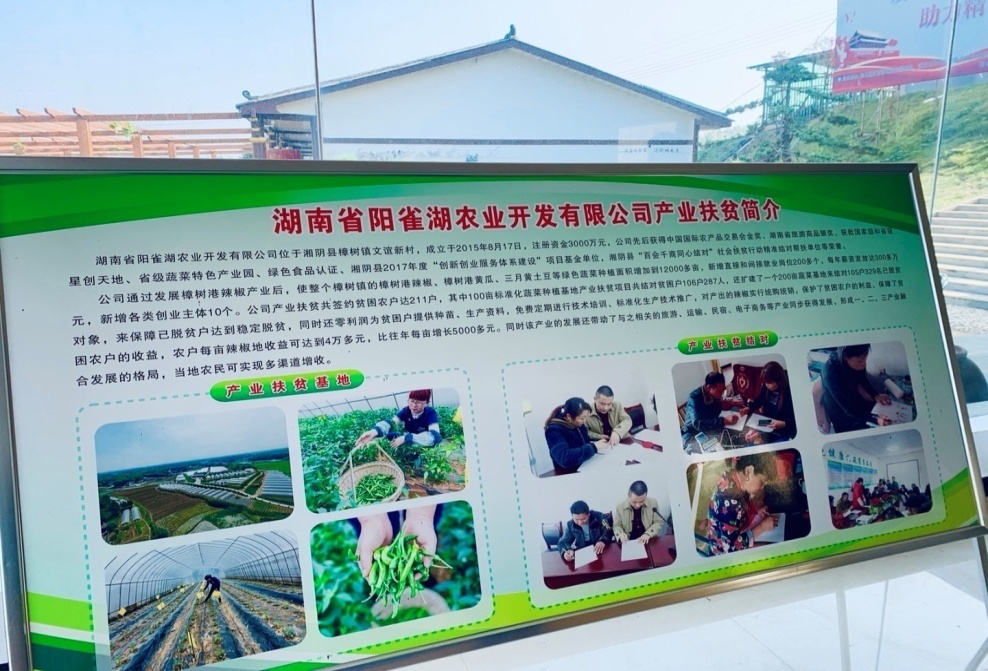 湖南省阳雀湖农业开发有限公司位于湘阴县樟树镇文宜新村,成立于2015年8月17日。公司通过发展樟树港辣椒产业后,使整个樟树镇的樟树港辣椒、樟树港黄瓜、三月黄土豆等绿色蔬菜种植面积增加到12000多亩,新增直接和间接就业岗位200多个,新增各类创业主体10个,公司产业扶贫共签约贫困农户达211户,同时该产业也带动了与之相关的旅游、运输、民宿、电子商务等产业的发展,当地农民可实现多渠道增收。