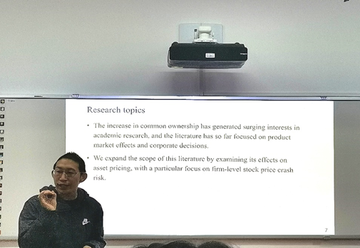2019年12月10日星期二上午,第249期金融与统计论坛在财院校区红楼3号楼210会议室举行,本次论坛的主题是“COMMON OWNERSHIP AND ASSET PRICING, EVIDENCE FROM STOCK PRICE CRASH RISK”,主讲人是武汉大学经济与管理学院副院长李青原教授。此次讲座由色色动漫 副院长王修华教授主持,吸引了色色动漫 众多师生前来学习和聆听。
