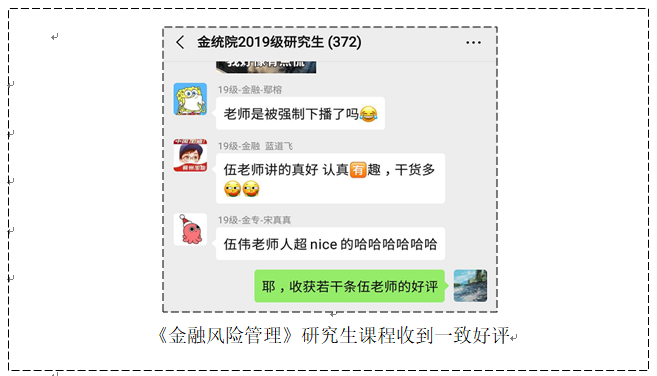 《金融风险管理》研究生课程的满满干货,伍伟老师幽默的讲课风格,研究生们回答问题时的踊跃,上课过程中的良好师生互动,都为知识的传递提供了极佳的空间。《金融风险管理》课程也受到了研究生群的一致好评。