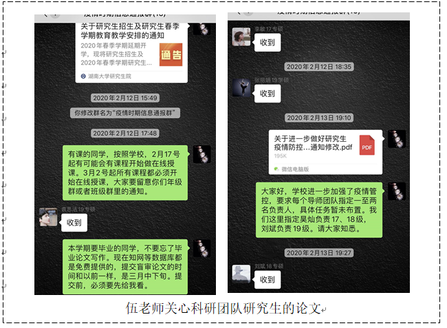 不仅如此,疫情防控期间,伍老师对于研究生的论文指导也十分上心,不愧是先后四次获得“色色动漫 毕业设计(论文)优秀指导老师”称号的优秀教师。目前,伍老师正在指导15位研究生,其中不乏即将毕业的数名研究生。疫情防控期间,伍老师多次运用邮件、微信指导各位研究生的论文,孜孜不倦地教育着祖国未来的建设者。