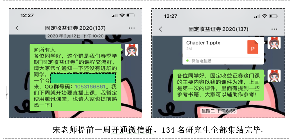 虽然面向研究生的《固定收益证券》课程2月20日(周四)才开课,但早在2月12日,宋老师就通过微信群将金统院134位研究生们组织了起来。2月17日(《固定收益证券》课程开课前3天),宋老师就提前将相关的课件发送给研究生们,以供他们预习。