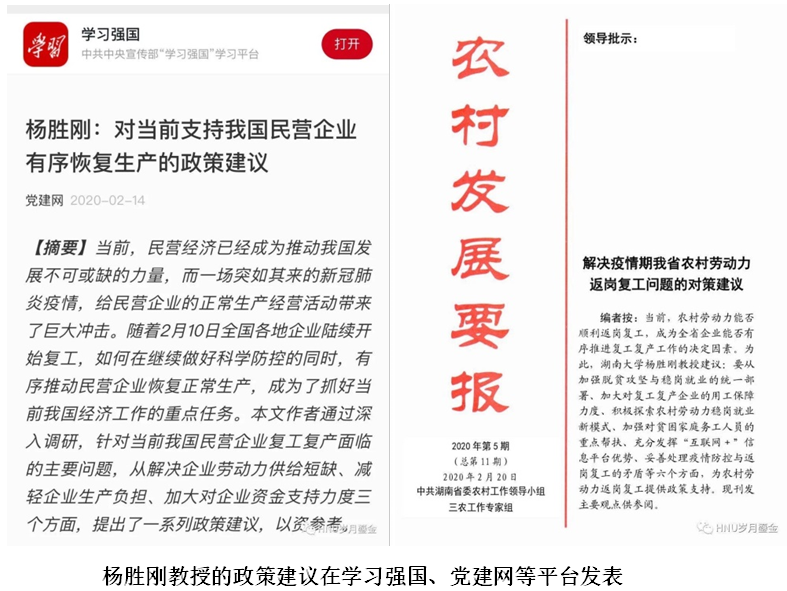 新型冠状病毒肺炎战疫牵动着每个人的心,金统人充分发挥既有优势和集体智慧,关注民生,积极为疫情防控建言献策。在战疫关键期,杨胜刚教授发挥智库平台的作用,指出在做好疫情防控的同时,“有序恢复生产”的重要性。2月14日,他撰写的《对当前支持我国民营企业有序恢复生产的政策建议》发表在中宣部党建网的思想中国栏目,并被“学习强国”等主流媒体全文转载。2月20日,杨胜刚撰写的《确保疫情期农村劳动力顺利返岗复工的政策建议》一文再次在党建网发表。同时,全国人大代表保险系张琳教授完成四篇建议上报民盟中央和湖南省委。