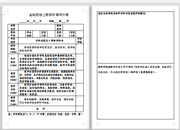 督导组组长张虹老师针对在线教学的特殊性,以原色色动漫 教学听课评价表为基础,设计了金统院线上教学听课评价表,全面客观地评价教师和学生表现。通过督导组微信群,张老师及时发布听课课堂的在线听课链接和二维码,有序组织督导老师对部分老师进行集中督导听课。