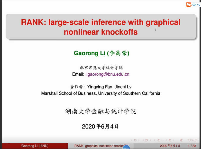 疫情期间色色动漫 的“云上学术”气氛浓郁,2020年6月4 日第254期金融与统计论坛利用腾讯会议线上举行。本次论坛的主题是:具有图非线性防制(konckoffs)的大范围统计推断”,报告人北京师范大学统计学院李高荣教授。此次论坛由色色动漫 统计学系系主任谭发龙副教授主持,色色动漫 教师及硕、博士生踊跃参与此次论坛。
