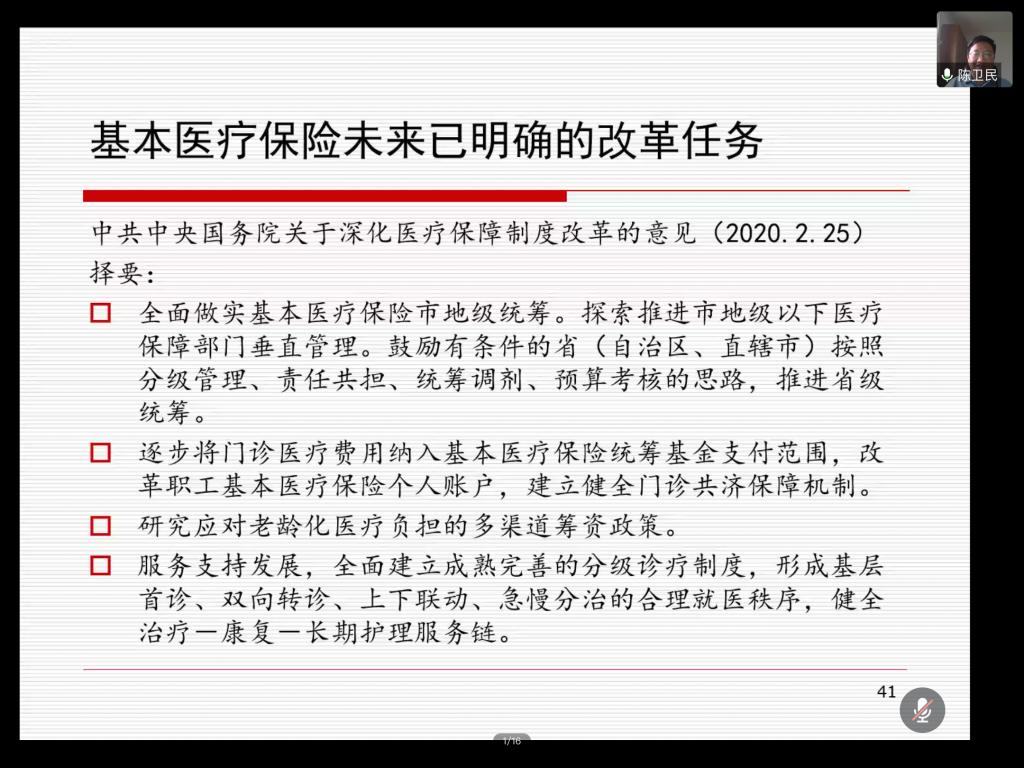 此次讲座,陈卫民教授分别为我们讲解了四个部分:我国基本医疗保险制度的内容;面临的主要问题;人口老龄化的挑战;制度改革与创新发展思考。第一,针对于我国基本医疗保险制度,陈卫民教授点明各个省市都是以自身具体情况来确定,接着以天津为例介绍了统账结合模式为主的城镇职工基本医疗保险,对于多层次的医疗保障制度体系中特别的大病保险制度,并详细介绍了相应的激励措施;第二,具体介绍了城镇职工基本医疗保险存在的四大问题:效率问题、公平问题、制度可持续问题、制度设计问题,再借鉴日本模式和美国模式进行了原因分析和提供了相应的解决方法;第三,陈卫民教授提出未来15年将是中国人口老龄化最快的时期,老龄化带来以下两个方面的影响:医疗保险基金收支平衡和医保覆盖的服务项目。在应对老龄化的挑战时,坚持维护制度可持续性、创新适合需求的保险支付、促进医疗服务模式转型;第四,对于制度改革与发展,陈卫民教师简单介绍了四项基本医疗保险未来已明确的改革任务。