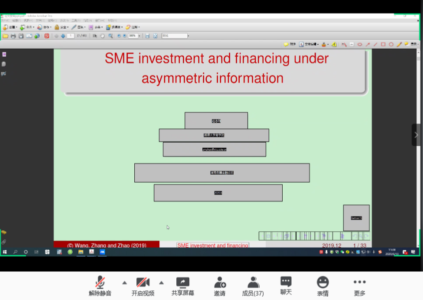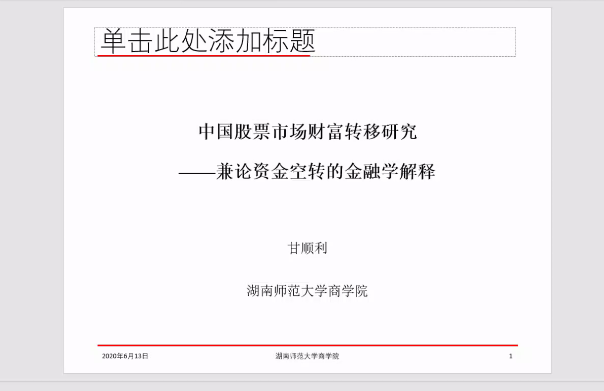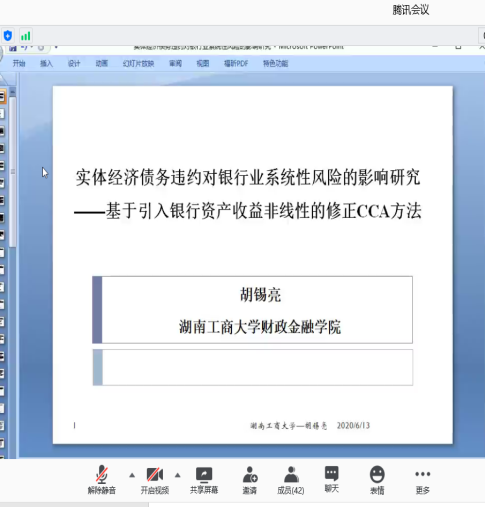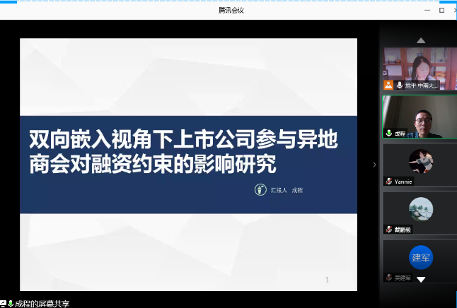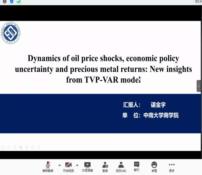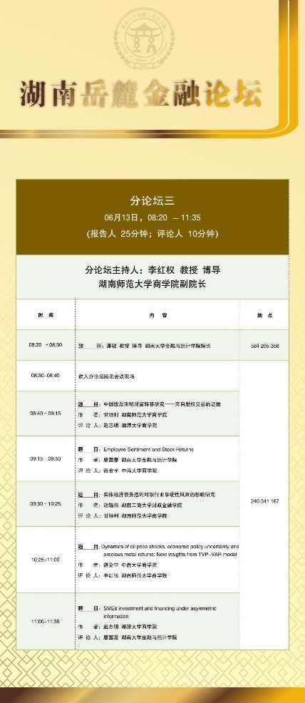 分论坛三由湖南师范大学商学院副院长李红权教授主持,首先由湖南师范大学商学院甘顺利助理教授汇报《中国股票市场财富转移研究——来自股权交易的证据》,本文以2007年第1季度至2019年第4季度中国上市公司股权交易为研究对象,估算了资金空转的收益,并考察了资金空转收益的决定因素;接下来由色色动漫 唐国豪助理教授汇报《Employee Sentiment and Stock Returns》,文章提出了员工情绪指数,作为投资者情绪与经理人情绪的补充,并在样本内和样本外发现了高员工情绪指数能够负向预测未来股票收益;接着湖南工商大学财政金融学院胡锡亮助理教授汇报《实体经济债务违约对银行业系统性风险的影响研究》,本文基于Merton(1974)的标准CCA方法,分析了实体经济债务违约对银行业系统性风险的非线性激增机制,明晰了Nagel & Purnanandam(2020)修正CCA方法嵌入的银行股权与负债“期权的期权”与银行资产收益非线性特征;接下来由中南大学商学院谌金宇副教授汇报《Dynamics of oil price shocks, economic policy uncertainty and precious metal returns: New insights from TVP-VAR model》,基于时变参数矢量自回归(TVP-VAR)模型,研究使用1990年4月至2018年4月的月度数据,着重分析了油价冲击和经济政策不确定性对贵金属收益的动态影响;最后由湘潭大学商学院赵志明助理教授汇报《SMEs investment and financing under asymmetric information》,研究在信息不对称的动态环境中受财务约束的中小企业的投资时机和融资决策。