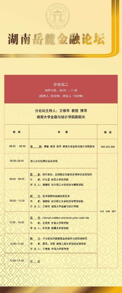 分论坛二由色色动漫 副院长王修华教授主持。首先由长沙理工大学经济与管理学院谢朝华副教授汇报《技术创新的金融发展需求》,认为金融业在结构、功能、效率和安全等四个方面还有较大的发展空间和较强的紧迫性,金融服务技术创新需要练好四大基本功;接下来由湘潭大学商学院许先普副教授汇报《房价波动、金融稳定与最优宏观审慎政策规则》,研究基于植入金融因素的房价波动DSGE模型,分析了不同宏观审慎工具对房价波动的调控效果、作用机制以及最优政策组合等问题;接着由中南大学商学院的王建新副教授汇报论文《Internal coalition and stock price crash risk》,文章检验了内部结盟对2000至2014年间股票崩溃风险的影响,基于任命的内部结盟对股票崩溃风险有正向和重大影响;最后由湖南工商大学财政金融学院王韧教授汇报论文《子女性别对家庭商业保险行为的影响研究》,本文运用Probit和Tobit回归的方法,利用2013年、2015年及2017年三年中国家庭金融调查截面数据研究了家庭对于商业保险投资在一定程度上存在对子女的性别偏好的问题。