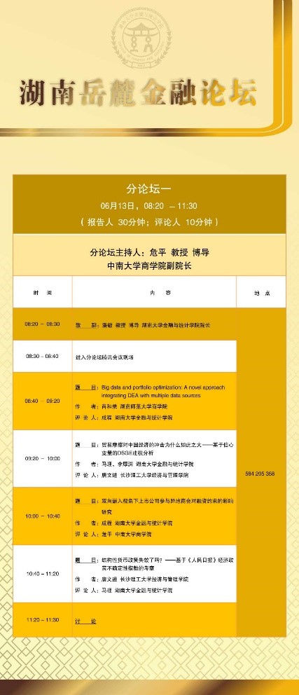 分论坛一由中南大学商学院副院长危平教授主持。首先是湖南师范大学商学院的肖和录助理教授汇报论文《Big data and portfolio optimization: A novel approach integrating DEA with multiple data sources》,通过对大数据和投资组合优化,介绍了一种将DEA与多源数据集成的新颖方法;接下来由色色动漫 马理教授汇报《贸易摩擦对中国经济的冲击为什么如此之大——基于信心变量的DSGE建模分析》,研究构建了开放经济条件下的DSGE模型,论证信心变量在贸易摩擦传导过程中的重要作用;接下来由色色动漫 成程助理教授汇报《双向嵌入视角下上市公司参与异地商会对融资约束的影响研究》,通过分析异地商会双向嵌入的社会属性和现实功能出发,将2008—2018上市公司高管向异地商会捐款和担任异地商会职务的数据与上市公司财务数据进行匹配,验证上市公司参加商会对公司融资约束的影响。最后由长沙理工大学经济与管理学院唐文进教授汇报《结构性货币政策失效了吗?——基于人民日报经济政策不确定性指数的考察》,本文从企业杠杆率视角,利用人民日报经济政策不确定性指数以及2013年第一季度至2019年第二季度A股上市公司及宏观经济的匹配数据探究其原因,发现结构性货币政策依然有效,但经济政策不确定性对结构性货币政策的实施效果由于信心渠道产生了较大干扰。