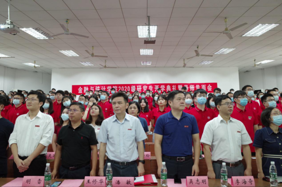 在奏唱国歌之后,院长潘敏致词。潘敏首先对新同学的到来表示衷心祝贺与热烈欢迎,并围绕“理想、奋斗、卓越”对同学们提出了三点建议:一是树立远大理想,让青春的脚步紧随家国的脉动,同校院一起开拓奋进;二是发奋成长成才,积极汲取知识,认真研读文献,踏踏实实调研,反反复复实验,将学术研究建立在坚实的基础之上;三是勇于追求卓越,向优秀校友看齐,努力超越前人,超越自己,擦亮“金融黄埔”这张名片。