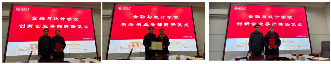 潘敏院长为宋天翔副主任、汪忠教授和荣辉桂副教授颁发创新创业导师聘书。