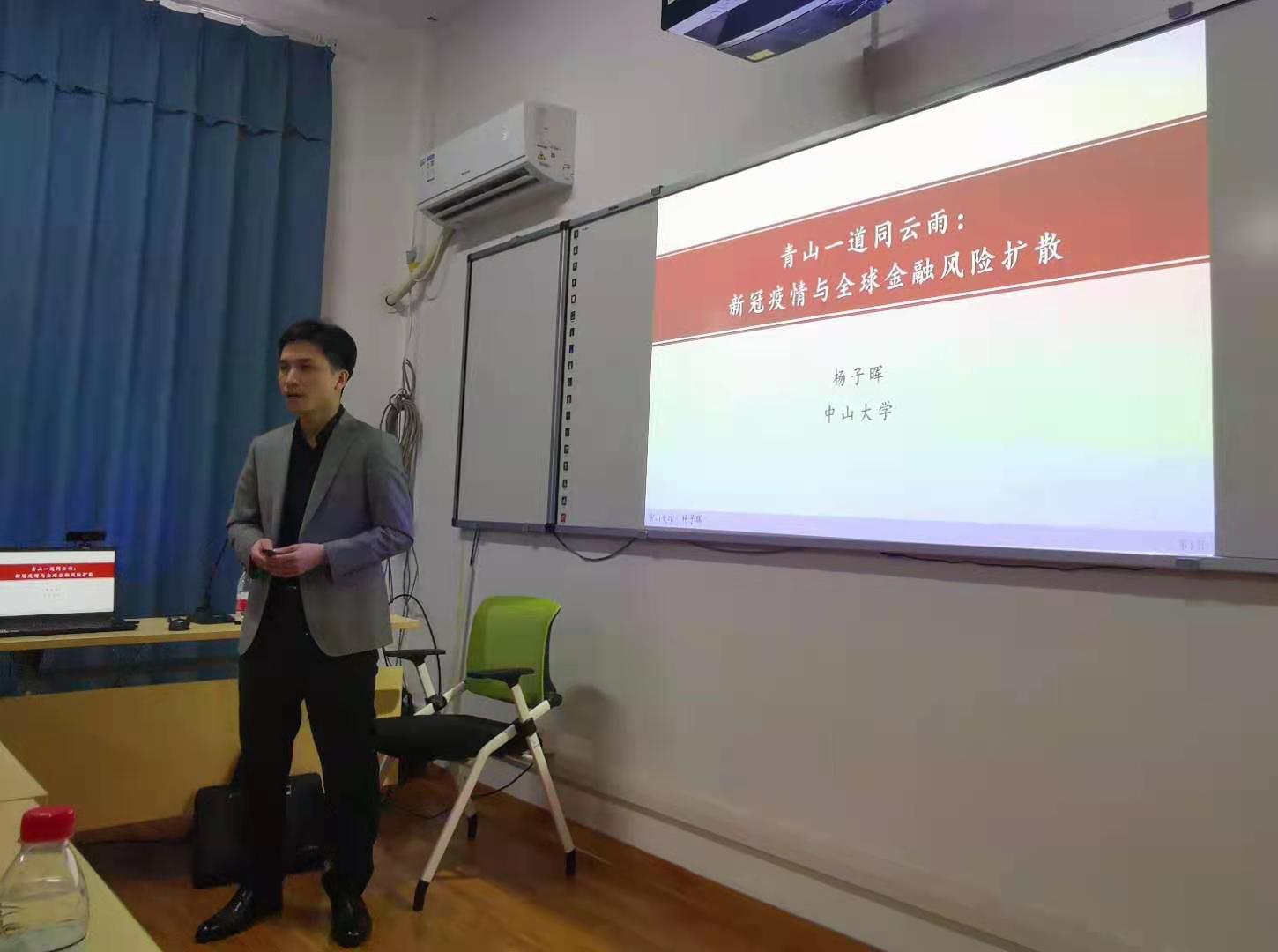 2021年3月26日下午,中山大学岭南学院杨子晖教授应邀来访色色动漫 ,并做题为“青山一道同云雨:新冠疫情与全球金融风险扩散”的学术讲座。讲座由色色动漫 马理教授主持,喻旭兰教授、梁巨方副教授、明雷副教授、赵静助理教授、赵丽娟助理教授、岳崴助理教授,以及部分博士生和硕士生参加了此次讲座,现场座无虚席,讲座受到了同学们的热烈关注与积极响应。