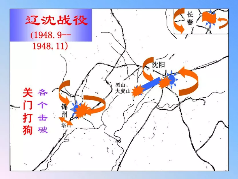 10月10日-15日,东北野战军一部在塔山地区浴血奋战六昼夜,成功地阻击住从葫芦岛援锦的敌军“东进兵团”。14日至15日,东北野战军主力经过31个小时的激战攻克锦州,把蒋介石在东北沟通华北的咽喉一举切断。17日,被长久围困的长春守敌一个军宣告起义;19日和21日,长春守军一个军和郑洞国率领的第一兵团部向人民解放军投诚。长春解放。