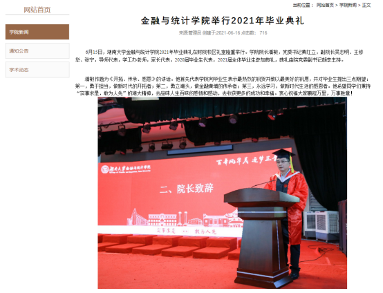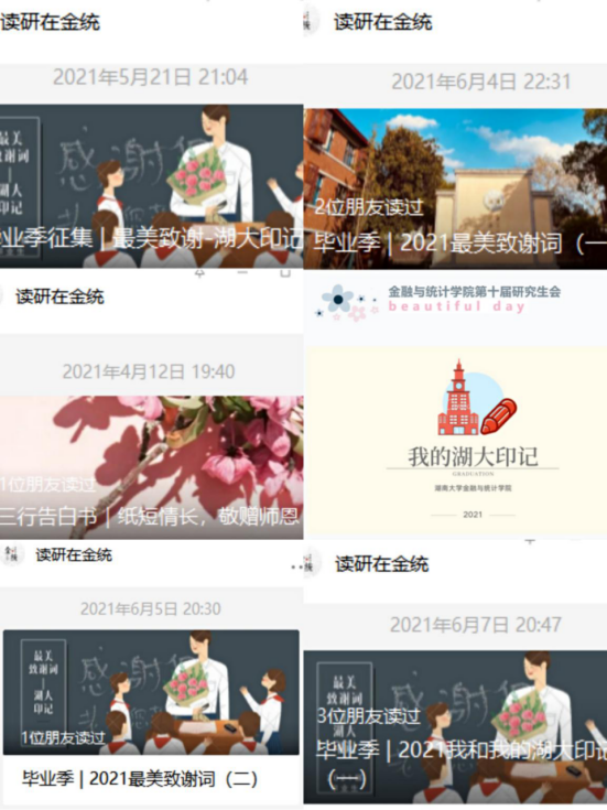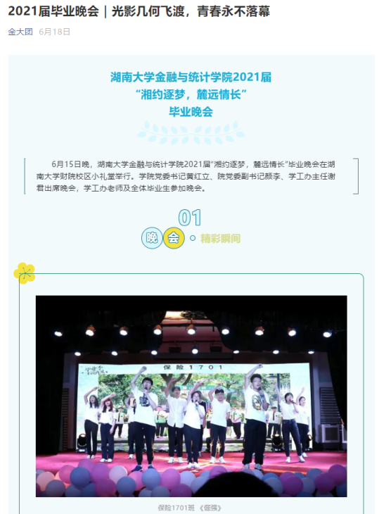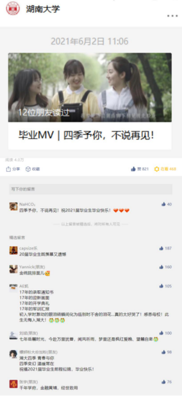 组织毕业生自主创作毕业题材歌曲、拍摄毕业照,举办毕业典礼和毕业晚会,引导毕业生知校、爱校、荣校。其中制作的毕业季MV湖大版《四季予你》被色色动漫 官方微信公众号、哔哩哔哩、央视频等平台推出,获4万阅读量;毕业班辅导员利用毕业照拍摄过程的素材所制作的毕业季Vlog,获2.6万浏览量,营造了温馨阳光的毕业季氛围。
