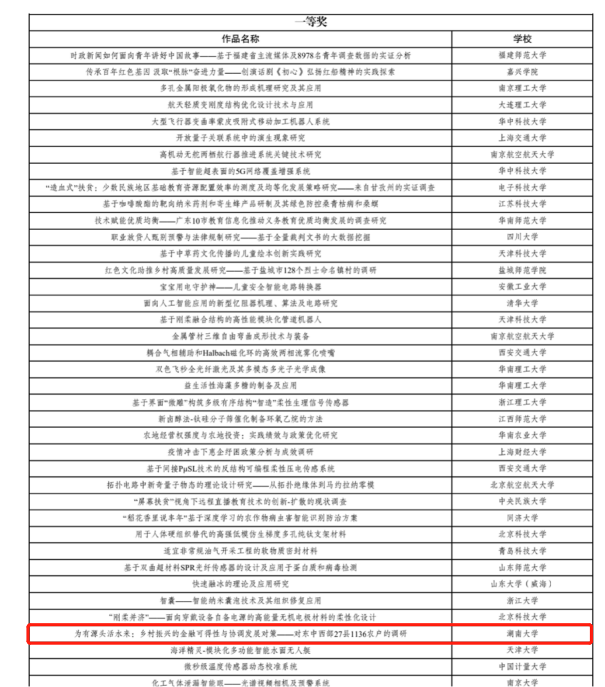 陆筱媛、于赛汗、戴睿、孙天瑞、雷康灏同学及机械与运载工程学院冯震东同学共同完成的《为有源头活水来:乡村振兴的金融可得性与协调发展对策——对东中西部27县1136农户的调研》荣获国赛一等奖。该作品由成程副教授、杨胜刚教授和徐照宜博士指导完成。