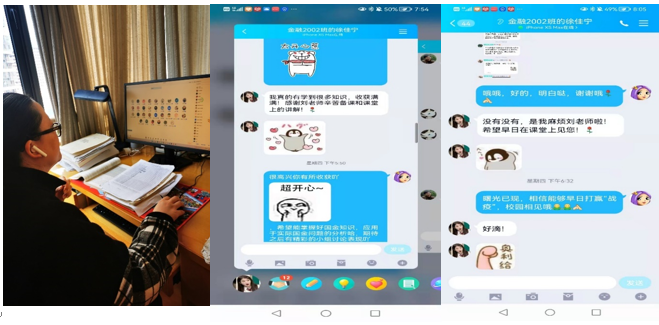 刘晓兰老师在线授课当天查看学生上课详情时,发现一位同学反复加入腾讯会议达14次,马上在QQ群里加该同学好友,了解到是因为该同学的寝室网络状况不佳,让她们寝室的同学都填写了校园网、在线教学问题反馈表,同时也向院教务办的李晖老师反映情况,问题得到了及时解决。学生感受到老师真挚的关心和帮助,相信之后的课程学习必然不会再“掉线”。