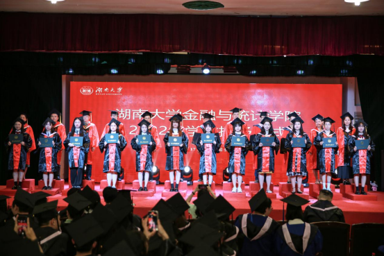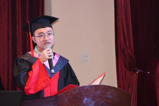 毕业生代表、2018级博士研究生徐照宜讲述了在湖大十年求学的成长故事和人生感悟,他表示是湖大让自己勇敢地尝试无限可能,湖大不仅仅只是研究学问的学术殿堂,更是“实事求是”的精神图腾;财院校区也不只是享受青春的大学校园,更是“经世致用”的文化象征。他祝福每位毕业生将自身发展同国家富强、民族复兴紧密结合,愿二十年后能用更响亮的声音向母校汇报,交出金统人无愧于国家和时代的答卷。