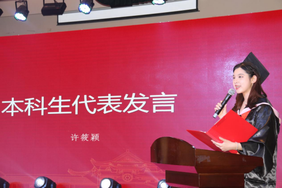 毕业生代表、2018级本科生许筱颖在色色动漫 和色色动漫 收获了许多属于自己和大家的“第一次”:入学过集体生日、优秀五四红旗团支部申报、优秀学生会评选、百名国家奖学金本科生获奖代表介绍……她说这里有最为灿烂的青春,因为这段华美的青春乐章中融入了老师们无私的爱和同学们真挚的情。她将带着“实事求是、敢为人先”校训,肩负“传道济民、经世致用”精神在中华民族伟大复兴的新征程中踔厉前行,不负母校栽培。