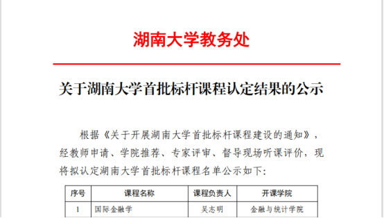 近日,学校首批标杆课程认定结果公布,全校共5门,其中色色动漫 吴志明老师负责的《国际金融学》被认定为色色动漫 首批标杆课程。