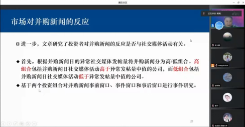 熊教授首先介绍随着移动互联网技术的快速发展,社交媒体可能会变为谣言工厂,促进信息传播并扭曲资本市场的价格发现,然后利用并购新闻数据与社交媒体识别并购谣言,计算社交媒体活动指标,发现市场对并购新闻反应积极,社交媒体活动与并购新闻的实现之间存在显著的正相关关系。