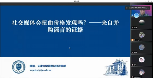2022年6月15日晚,天津大学管理与经济学部的熊熊教授应邀进行了主题为《社交媒体会扭曲价格发现吗?来自并购谣言的证据》的学术讲座,共计90余名师生参加了此次讲座。学院王修华教授主持本次讲座。