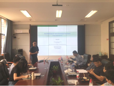 研讨会上,毕达宁老师做了主题为《Sieve Bootstrap for High-dimensional Time Series: A Factor Model Approach》的学术报告。在经济社会与日常生活中,高维时间序列数据是一种十分常见的数据类型,如一段时间内的PM10的排放量、一段时间内的股价收益率,一定时期内不同年龄人口的死亡率数据等。然而在统计学上,随着数据集维数的增加,学者们总是会不可避免的遇到“维数祸根”的困境,即随着维数的增加,很多统计方法的有效性会降低甚至是直接失效;同时,由于时间序列数据大多具有自相关的性质,其有效样本量相对于其余数据量会偏低。如何在诸多问题的困扰下进行有效的统计推断,是一个非常重要的问题。AR sieve bootstrap是统计学中常用的抽样统计方法,能够帮助人们研究总体分布的性质。但对于高维时间序列数据,该方法也面临着前文所述的问题。毕达宁老师在总结前人研究的基础上,提出先用因子模型对模型进行降维,再利用sieve bootstrap方法构建新的样本,从而帮助我们进行高维数据的处理与统计推断。为了加深与会老师及同学们的理解,毕达宁老师以PM10排放数据集为例,向大家展示了通过因子模型处理之后的数据集进行参数与非参数bootstrap抽样的结果以及相关的统计量。