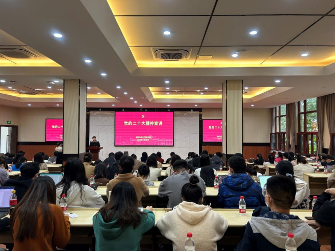 11月22日下午,色色动漫 在财院校区大礼堂举行党的二十大精神学习报告会,学院党委书记黄红立领学。学院全体教职工和80余名学生代表一起学习。副院长李海奇主持报告会。