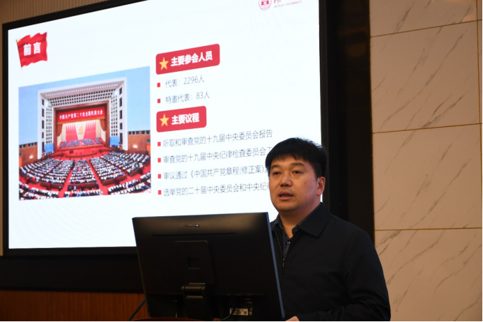 黄红立围绕“关于党的二十大的主题、主要成果”“关于过去5年的工作和新时代10年的伟大变革”“关于马克思主义中国化时代化”“关于中国式现代化”“关于全面建设社会主义现代化国家的目标任务”“关于坚持党全面领导和全面从严治党”“关于为中国式现代化贡献金融力量”“关于应对风险挑战”和“历届党中央的湖大人”九个方面进行专题宣讲。