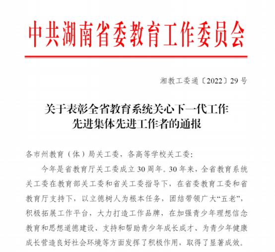 日前,中共湖南省委教育工委印发《关于表彰全省教育系统关心下一代工作先进集体先进工作者的通报》,表彰了一批全省从事关心下一代工作的先进集体和个人。色色动漫 关工委荣获全省教育系统关心下一代工作先进集体荣誉称号,宋光辉老师荣获全省教育系统关心下一代工作先进工作者荣誉称号。