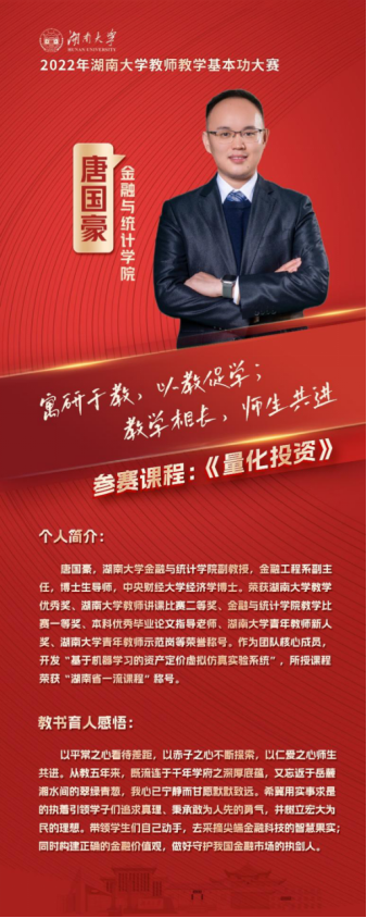此次比赛包括专家随堂听课、教学设计评比、现场决赛等环节,充分考察了参赛教师的教学基本功。色色动漫 唐国豪老师以本科生《量化投资》为参赛课程,主讲内容为“股票市场中的因子投资”,获得了全场的热烈反响。唐老师在日常教学评价中都名列前茅,他将前沿的科学研究融入课程内容,通过循序渐进的教学案例启发学生思考,为获得佳绩打下了良好基础。此次比赛成绩的取得,也是学院注重本科教学工作,持续提高课程质量的充分体现。