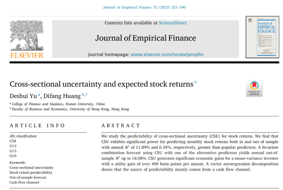 近日,色色动漫 金融工程系余得水助理教授的题为“Cross-sectional uncertainty and expected stock returns”的论文在院定A类期刊《Journal of Empirical Finance》,volume 72, June 2023发表。