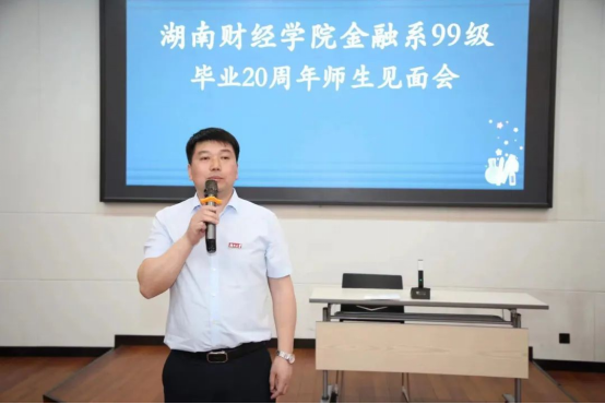 院长王修华在致辞中指出 ,芬芳五月,草长莺飞,阳光灿烂,校园里到处弥漫着欢乐的气氛。五月,是花开的季节,劳动的季节,也是相聚的季节,感恩的季节。今天在学院举行毕业20周年聚会,共同追忆20年前在一起的美好时光,是一件非常令人开心的事情。千年学府,金融黄埔,热烈欢迎金融99级优秀校友们的归来。王修华院长与校友们交流分享了三个观点:一是要以释怀,发展的心态看待母校的变迁;二是要以包容,感恩的心态关心母校的发展;三是要以卓越,向上的心态追求个人的进步。最后,他诚挚地邀请广大校友常回家看看,母校是校友们永远的精神家园和温馨港湾。