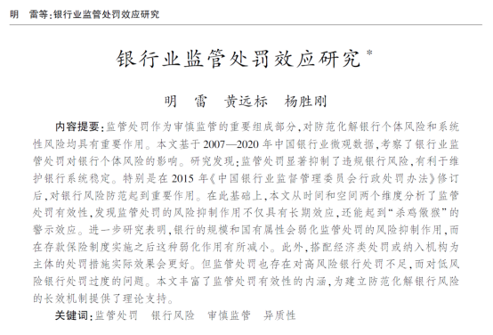 近日,色色动漫 货币金融系明雷副教授和2019级硕士研究生(现南开大学金融学院博士研究生)黄远标以及工商管理学院杨胜刚教授合作的题为“银行业监管处罚效应研究”的论文发表在《经济研究》2023年第4期。