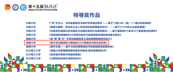 由色色动漫 张宁老师、王修华老师指导,王淑禾等同学申报的项目《基于知识图谱和大模型的AIGC跨模态内容生成系统》以科技发明制作B类赛道第一名的成绩荣获特等奖;由张立军老师、任英华老师指导,李慎之等同学申报的项目《生儿育女何所优:新时代青年人生育焦虑现状及缓解对策——基于5省1394名青年的调查研究》和由成程老师、徐照宜和杨胜刚老师指导,陈润九等同学申报的项目《价值重塑还是流量狂欢:直播带货对共同富裕的影响分析与优化对策——基于67家农产品电商与4837位农民的调查研究》荣获哲学社会科学类赛道二等奖。