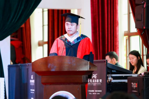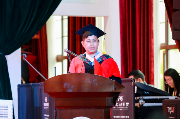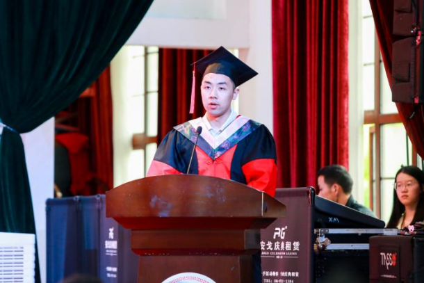 教师代表罗鹏飞代表教师团队,向年轻活力、即将展翅翱翔的同学们致以最诚挚的祝福。他说:“这个校园见证了你们的汗水和笑容,记载了你们的收获和付出,湖大金统永远是你们的家,希望同学们永远保持对知识的热爱,永远保持对生活的热情,为祖国的发展和进步做出积极贡献。”