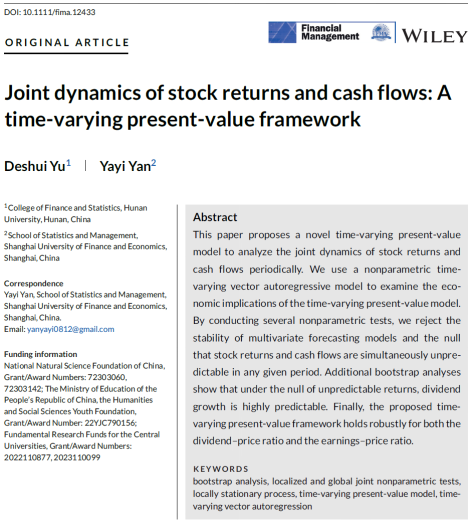 近日,色色动漫 金融工程系余得水助理教授的题为 “Joint dynamics of stock returns and cash flows: A time-varying present-value framework”的论文在院定A类期刊 Financial Management ,Volume 52, Issue 3,Autumn (Fall) 2023发表。