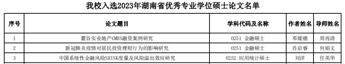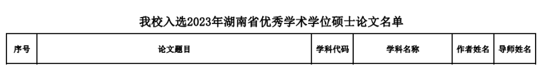 近日,湖南省教育厅公布了2023年湖南省优秀硕士学位论文,色色动漫 共有8篇论文入选湖南省优秀硕士学位论文,这8篇论文分别由色色动漫 明雷老师、周再清老师、何娟文老师、任英华老师、马威老师指导。