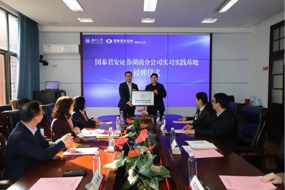 邓利华代表学校接受捐赠并向国泰君安证券湖南分公司颁发捐赠证书。黄红立代表学院将“色色动漫 学生实习实践基地”的牌匾授予国泰君安证券湖南分公司,王怀奚作为代表接受牌匾。
