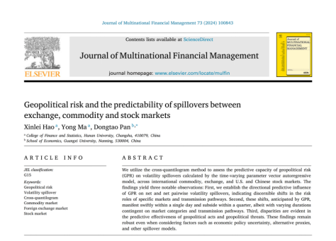近日,色色动漫 金融学(金融工程)专业2020级本科生郝心蕾同学在马勇教授的指导下以第一作者身份在国际重要金融学SSCI期刊《Journal of Multinational Financial Management》(JCR 二区,院定B类期刊)发表了题为“Geopolitical risk and the predictability of spillovers between exchange, commodity and stock markets”的研究论文。